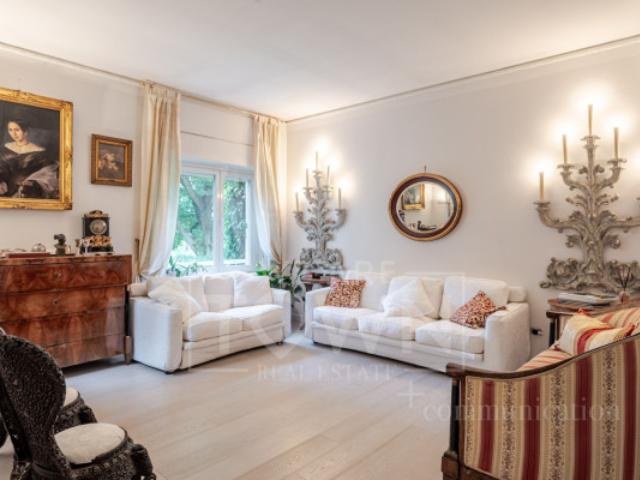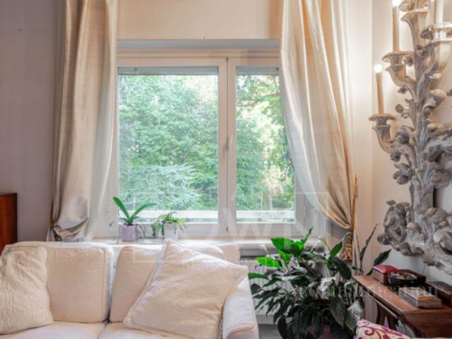 La zona giorno comprende un soggiorno triplo estremamente luminoso con accesso a un terrazzo vivibile affacciato sul parco, cucina abitabile e studio, perfetto per smart working o zona lettura. La zona notte offre due camere matrimoniali (una con balcone), due bagni finestrati e un ampio ripostiglio/cabina armadio, ideale per ottimizzare gli spazi.